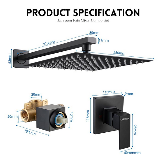 Chenshia 25cm Square Shower Heads-Square Arm,Valve Body &Square Mixer Black